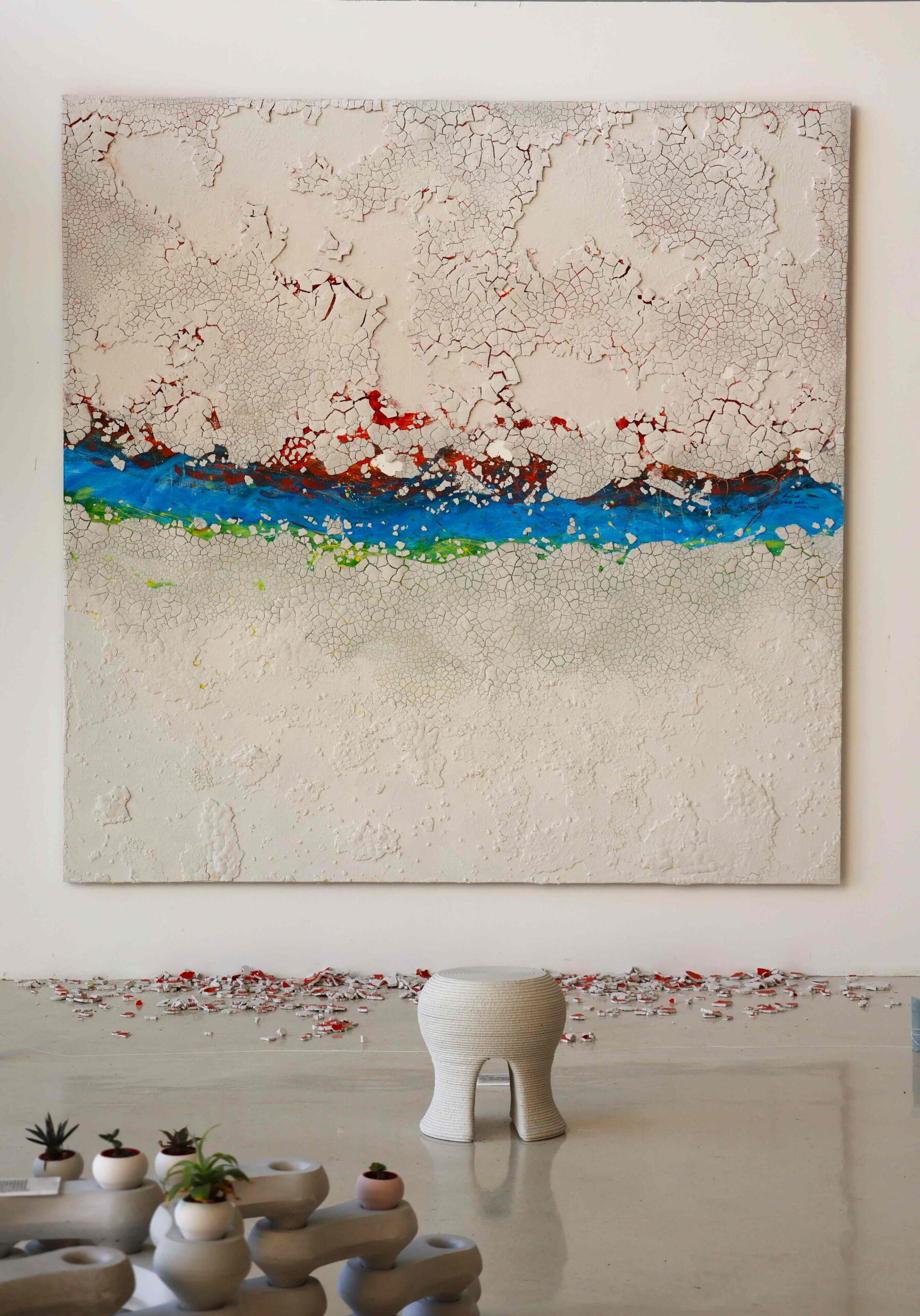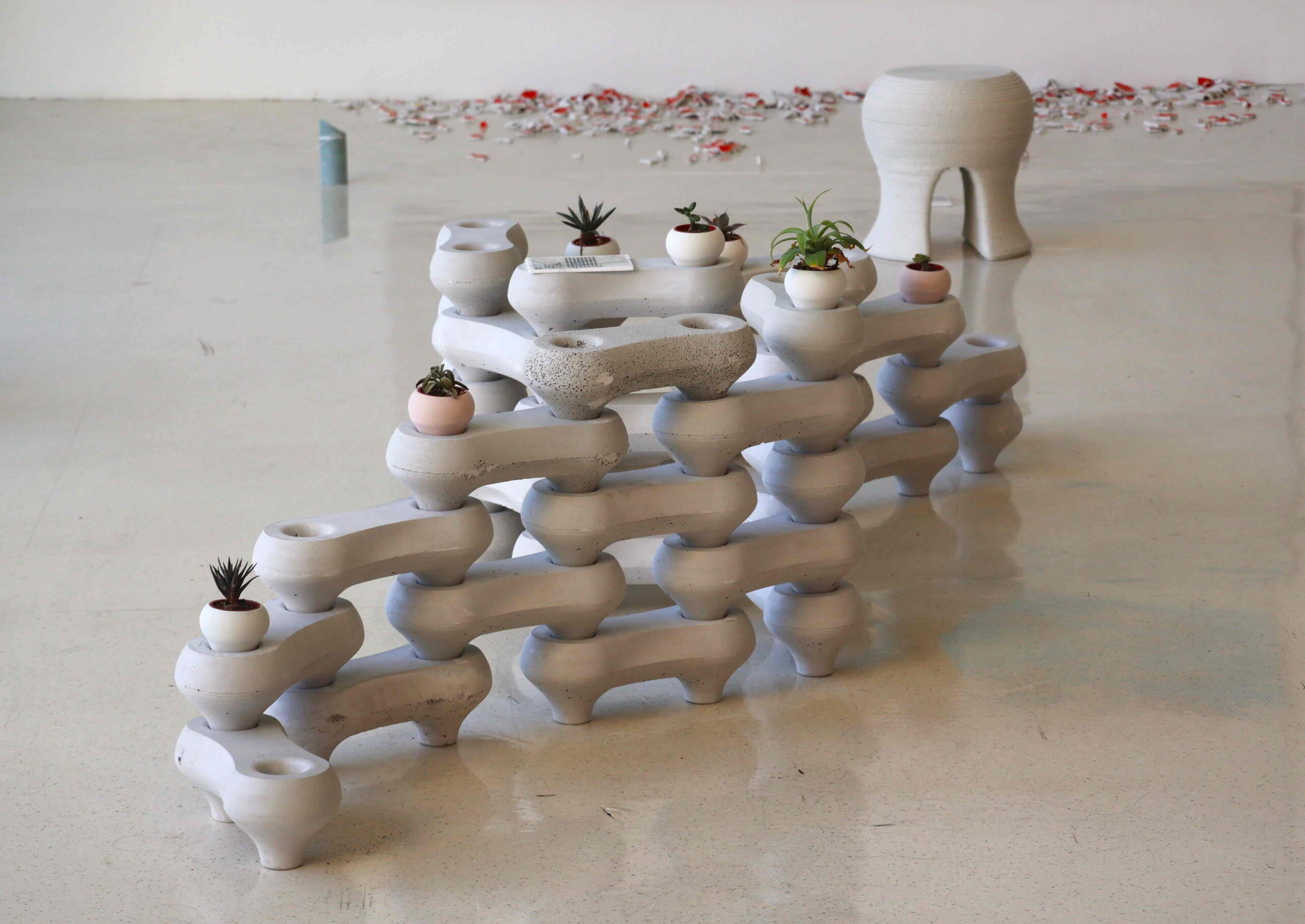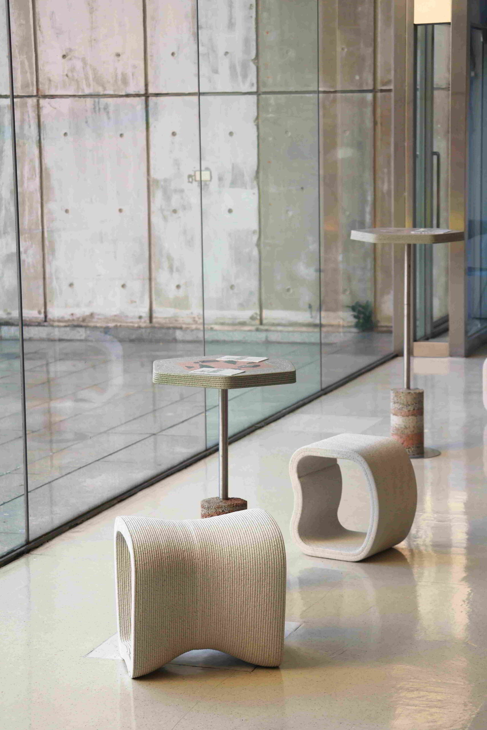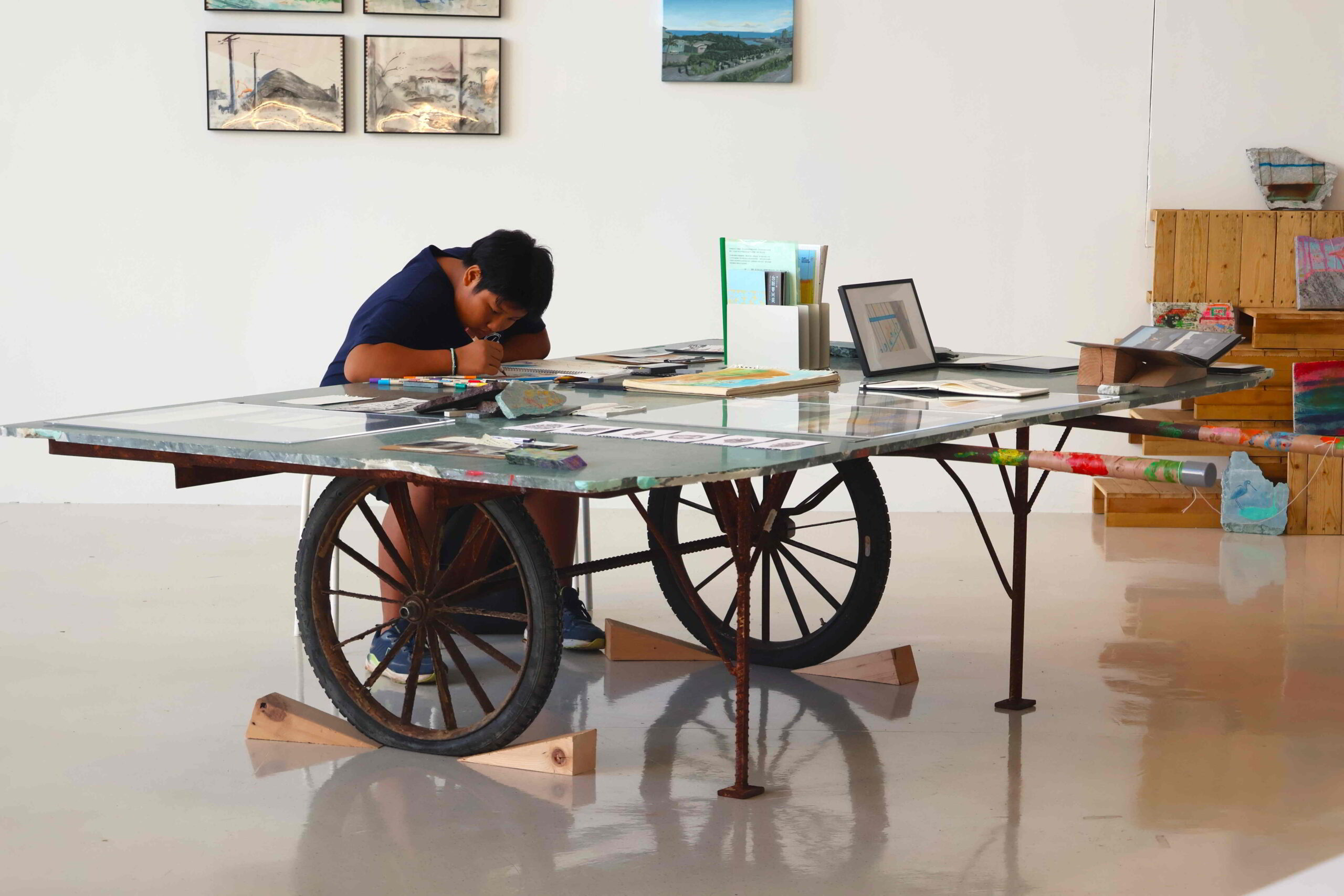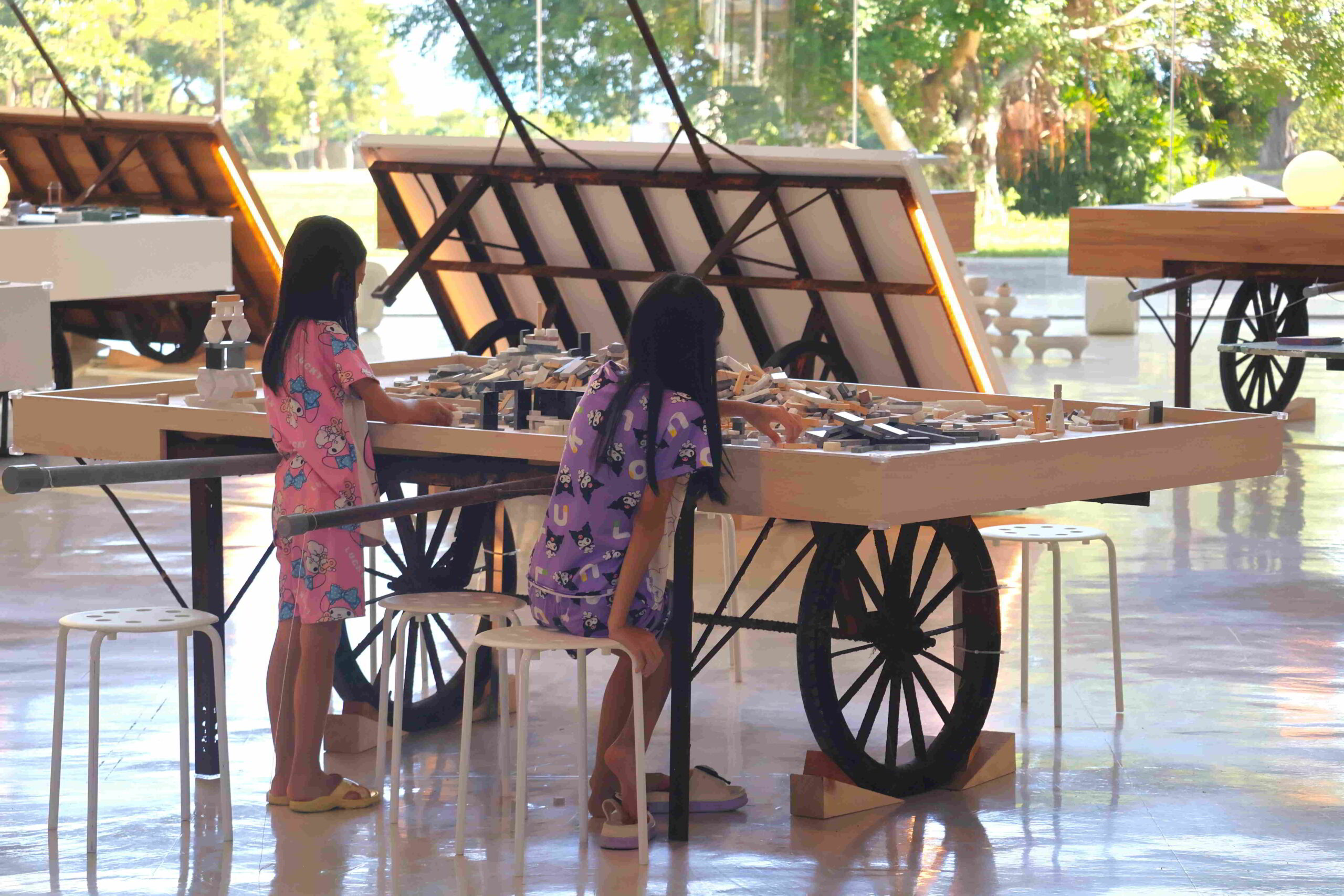 Children play with pieces of polished marble at tables set out to engage young visitors, although the meaningfulness of engagement is largely tied to a minimum age, judging by the random flailing of some of the youngest participants. The entire side of the cavernous main hall looks out over an expansive lawn dotted with large-scale sculptures.