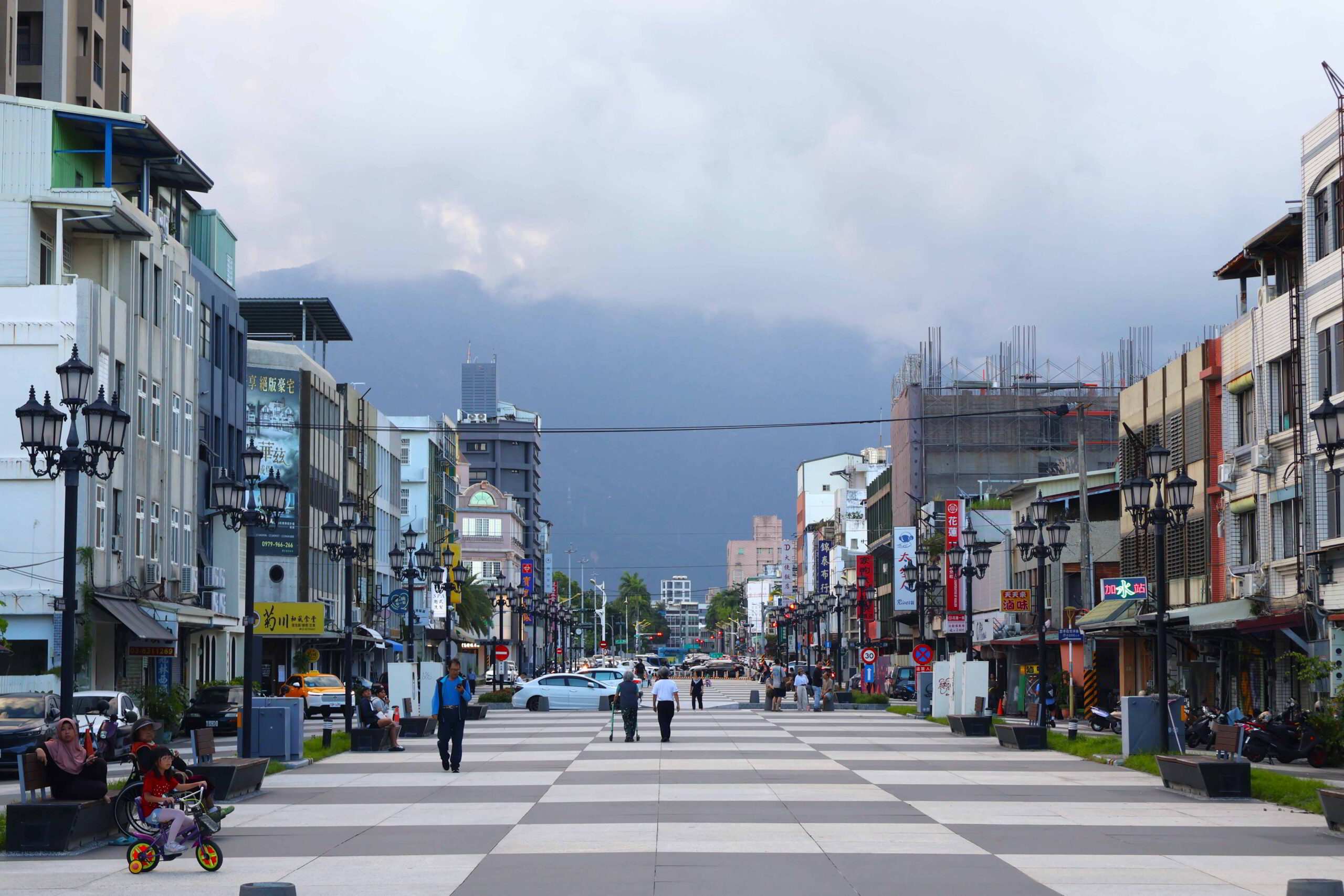 By the time I leave, the afternoon is already waning – nothing like astute time management! The beaming sunlight of the earlier hours of the day is also gone, the sky again overcast in anticipation of another set of rainy days, not surprising, considering how consistently bad the weather has been in Taiwan since I arrived at the beginning of November. But the character of the old town is evident in all directions emanating from the cafe and Ziyou Street on which it is set, what with the patterned flagstone-tiled boulevard separated into directional vehicular roads running on either side and the wider pedestrian concourse along the centre. Contrast is provided by the historic street lamps that line the boulevard and the soaring hills on the horizon, partially shrouded in billowing clouds.