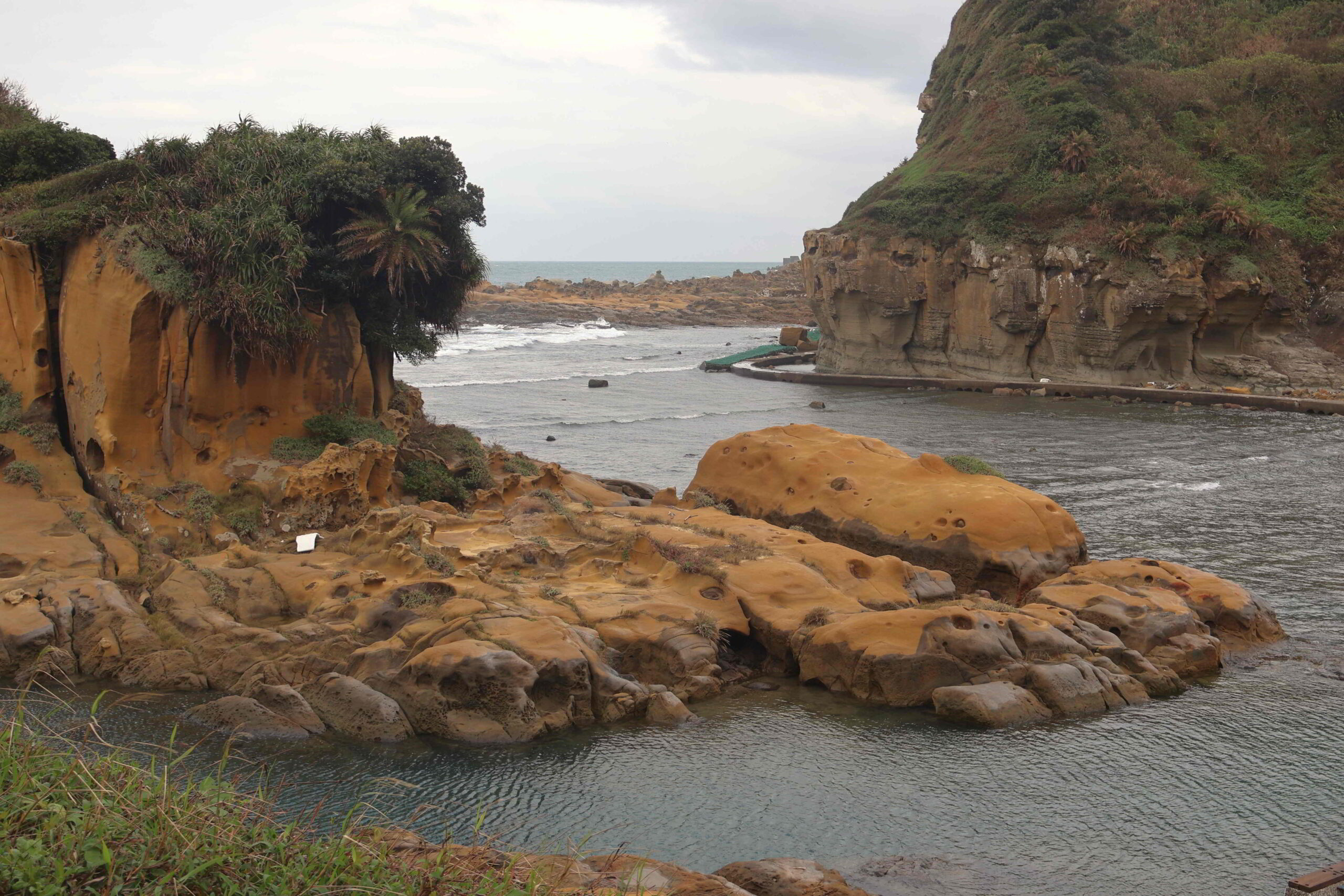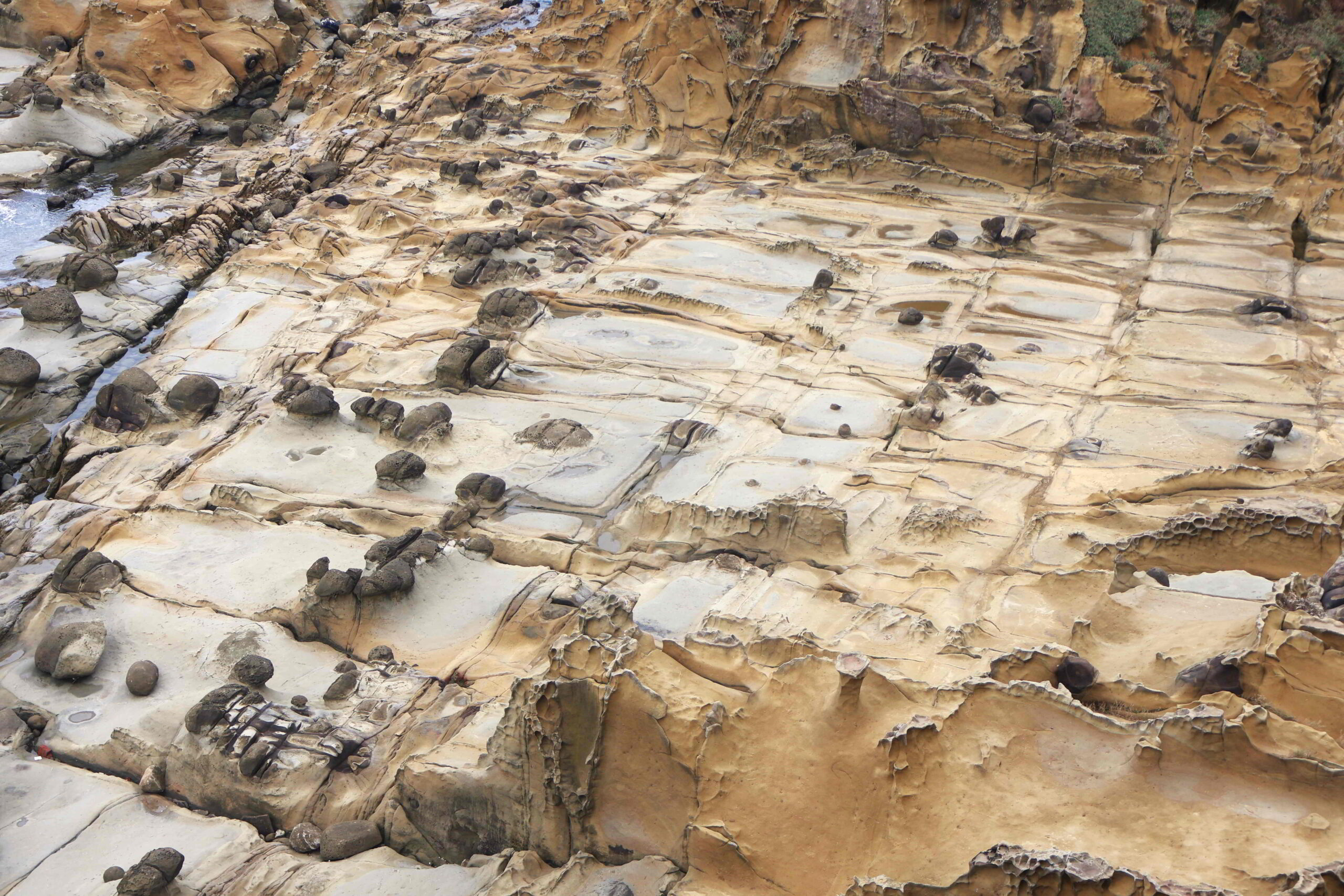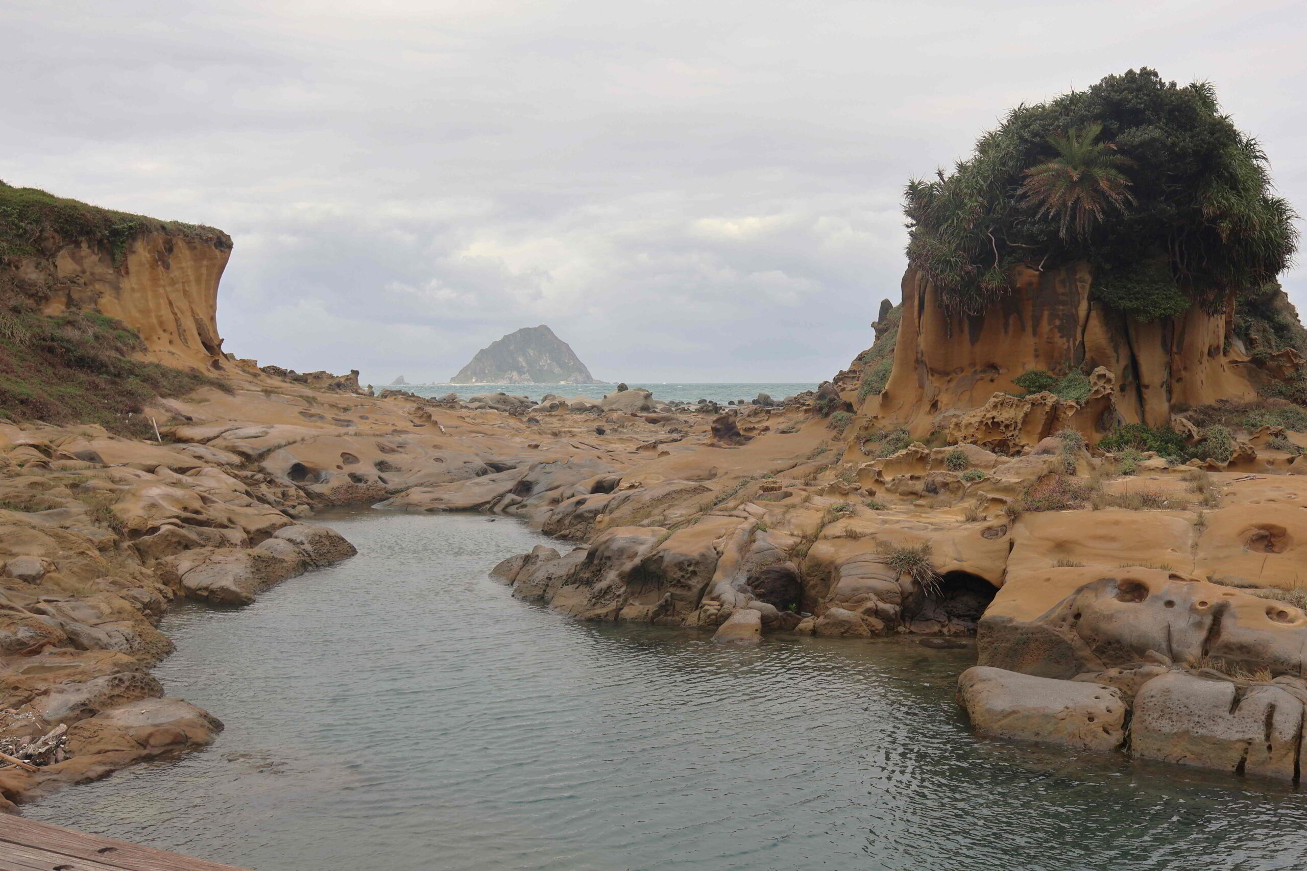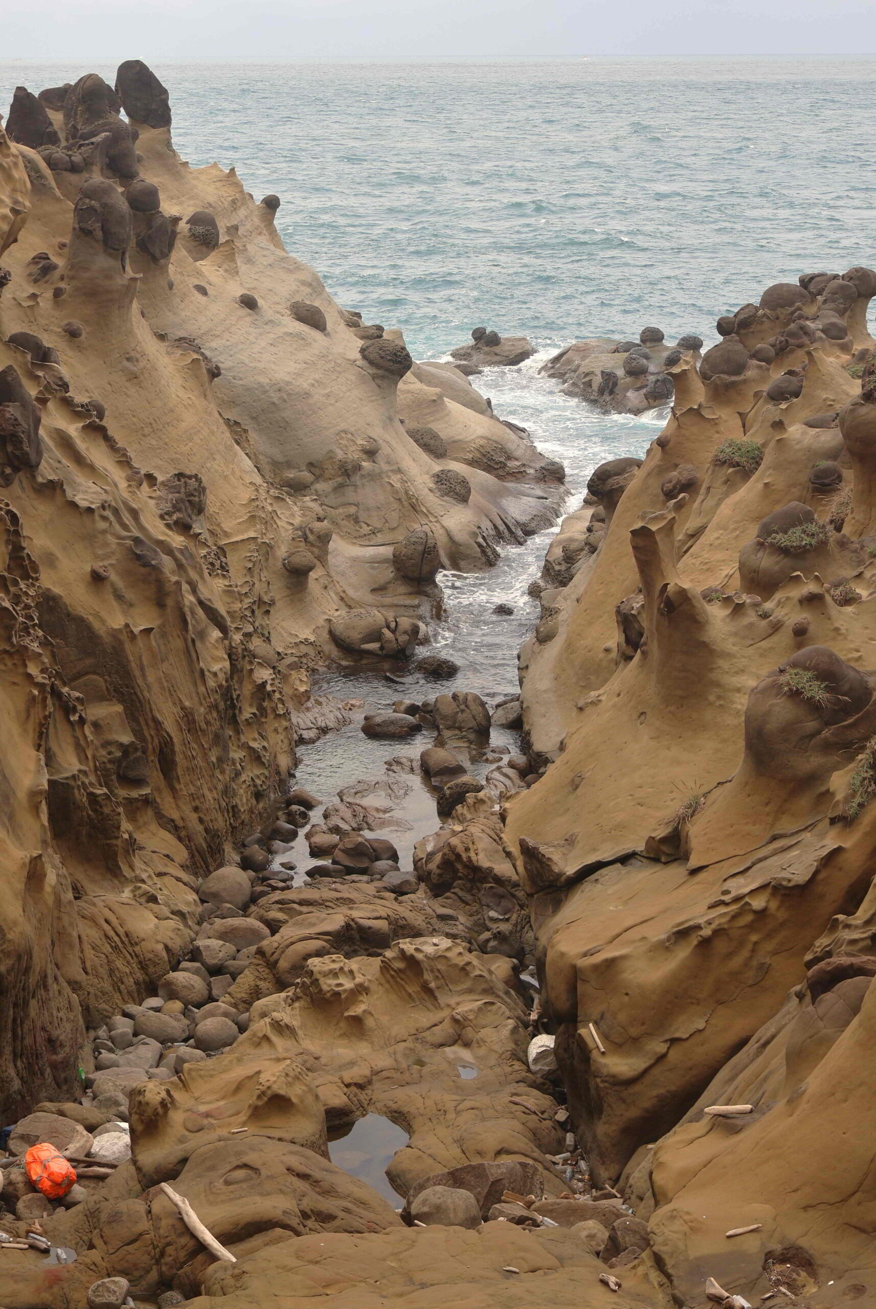 The boardwalk passes a fringe of padanus growing along the periphery of the undulating sandstone flats, a reminder of Taiwan’s subtropical ecology, culminating at an elevated gazebo and small terrace before returning to the area of the casbah structure. Due to the distance to the many tidal pools that litter the rocky shelves, I can’t tell how abundant aquatic life in in this environment, although I do see hawks flying far overhead.