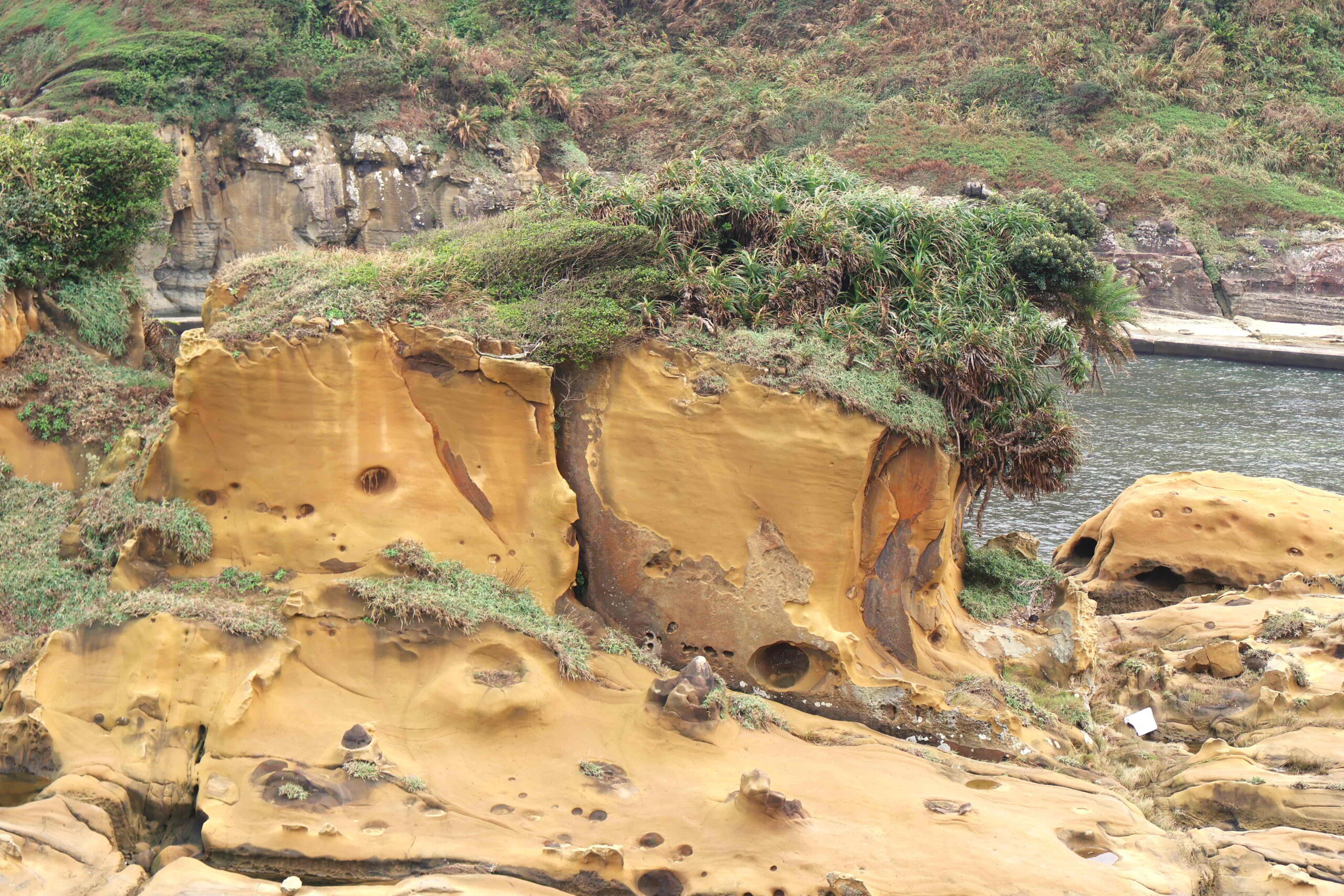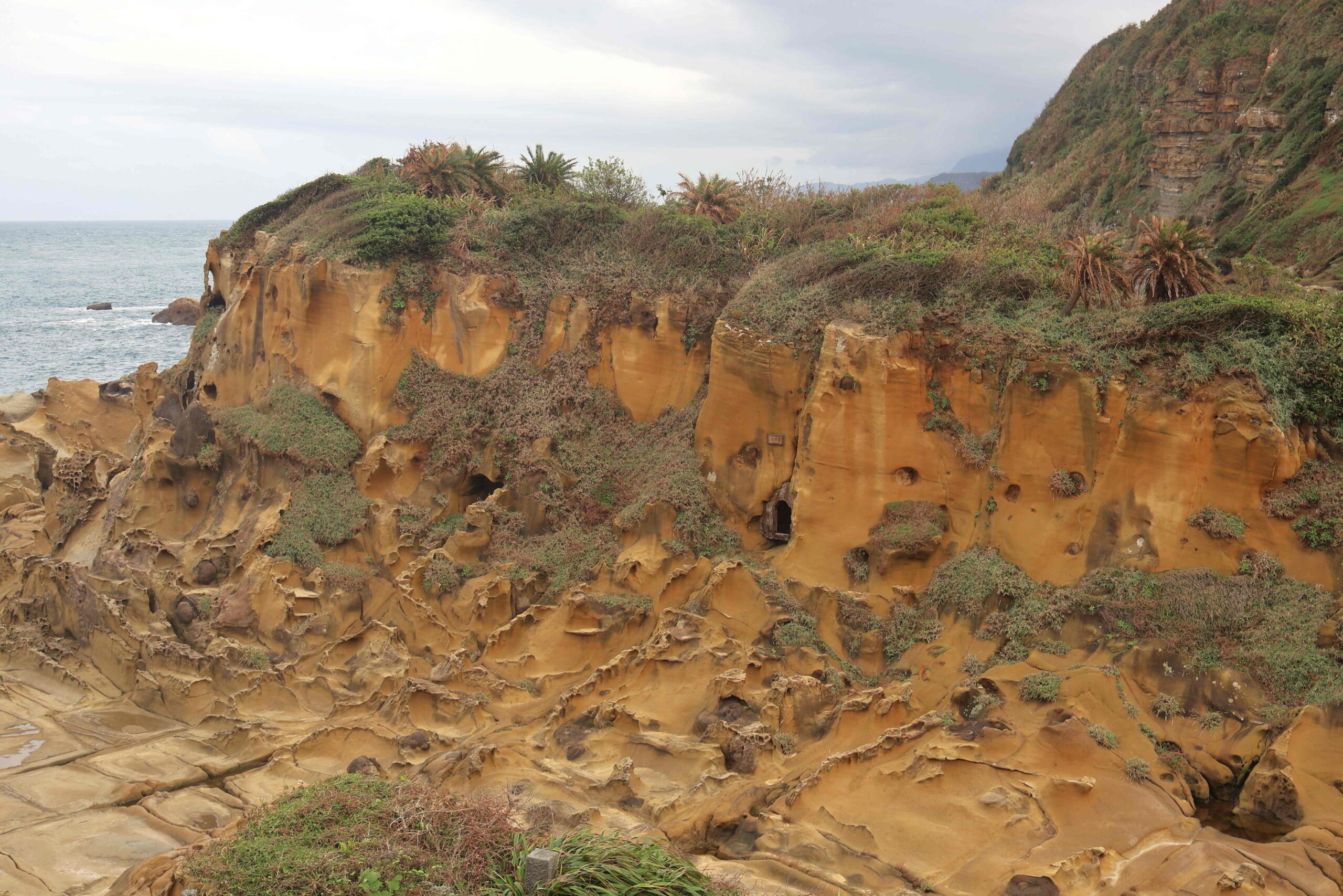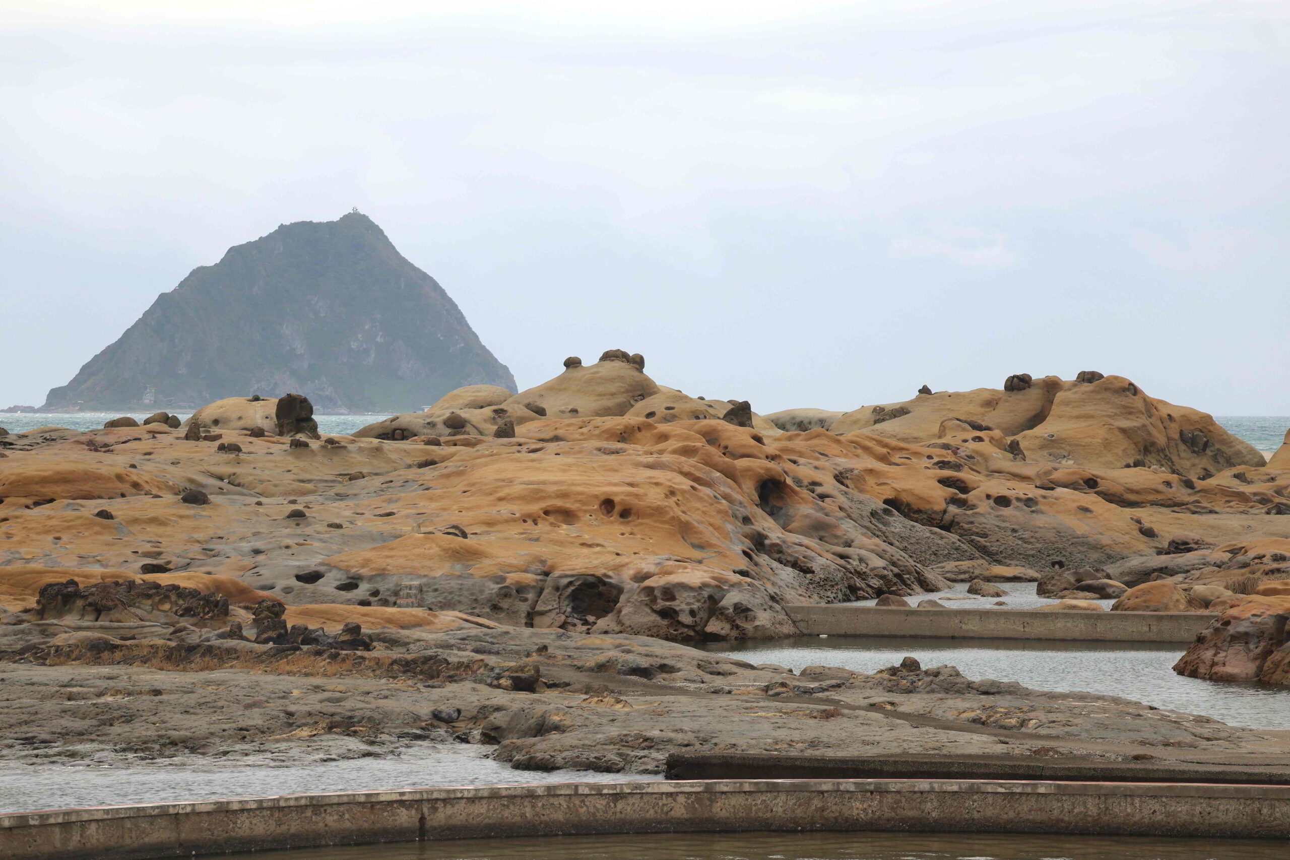The boardwalk passes a fringe of padanus growing along the periphery of the undulating sandstone flats, a reminder of Taiwan’s subtropical ecology, culminating at an elevated gazebo and small terrace before returning to the area of the casbah structure. Due to the distance to the many tidal pools that litter the rocky shelves, I can’t tell how abundant aquatic life in in this environment, although I do see hawks flying far overhead.
