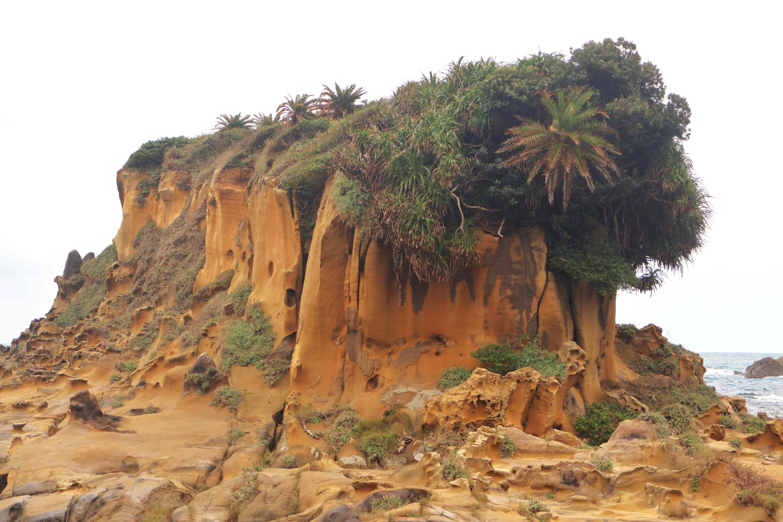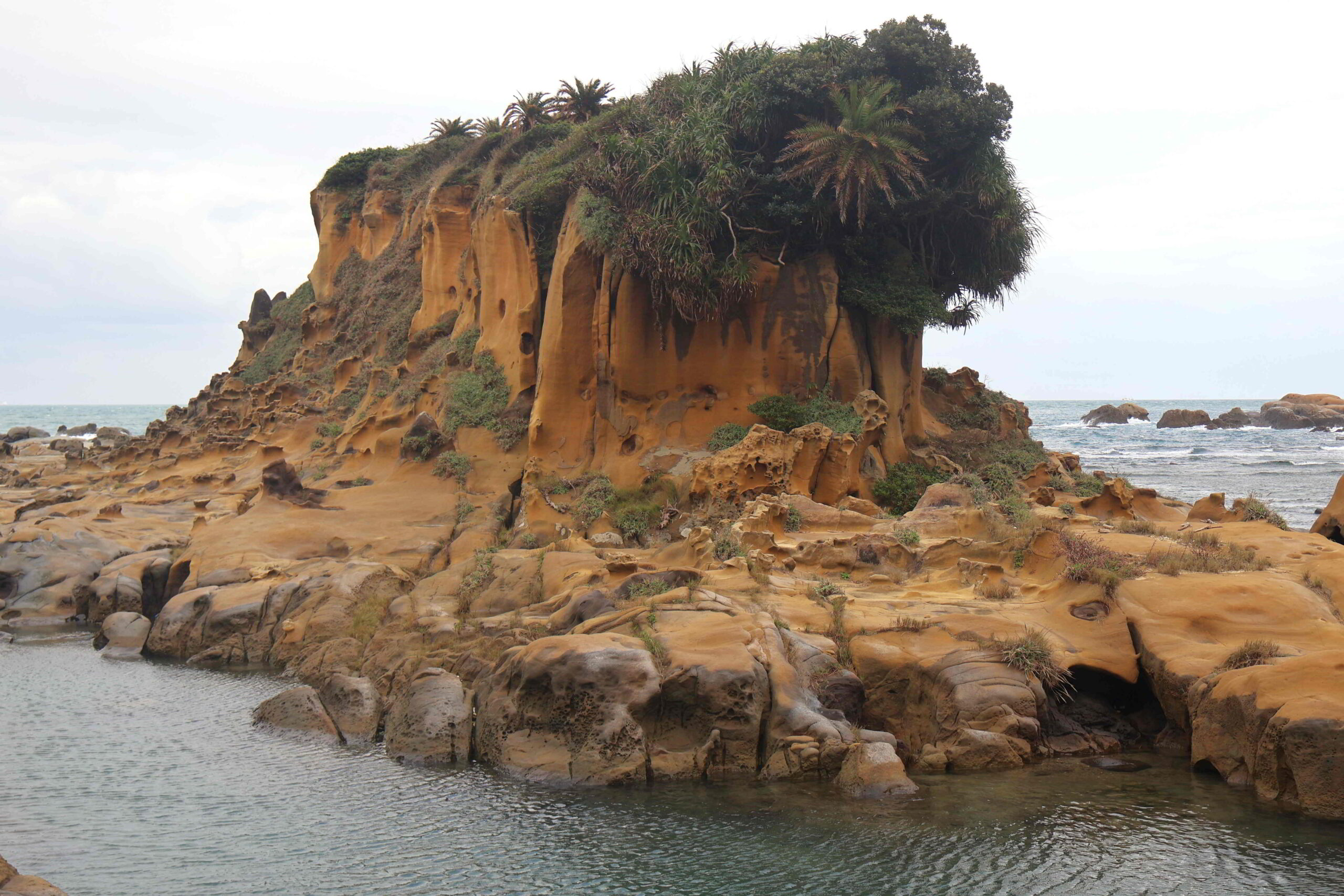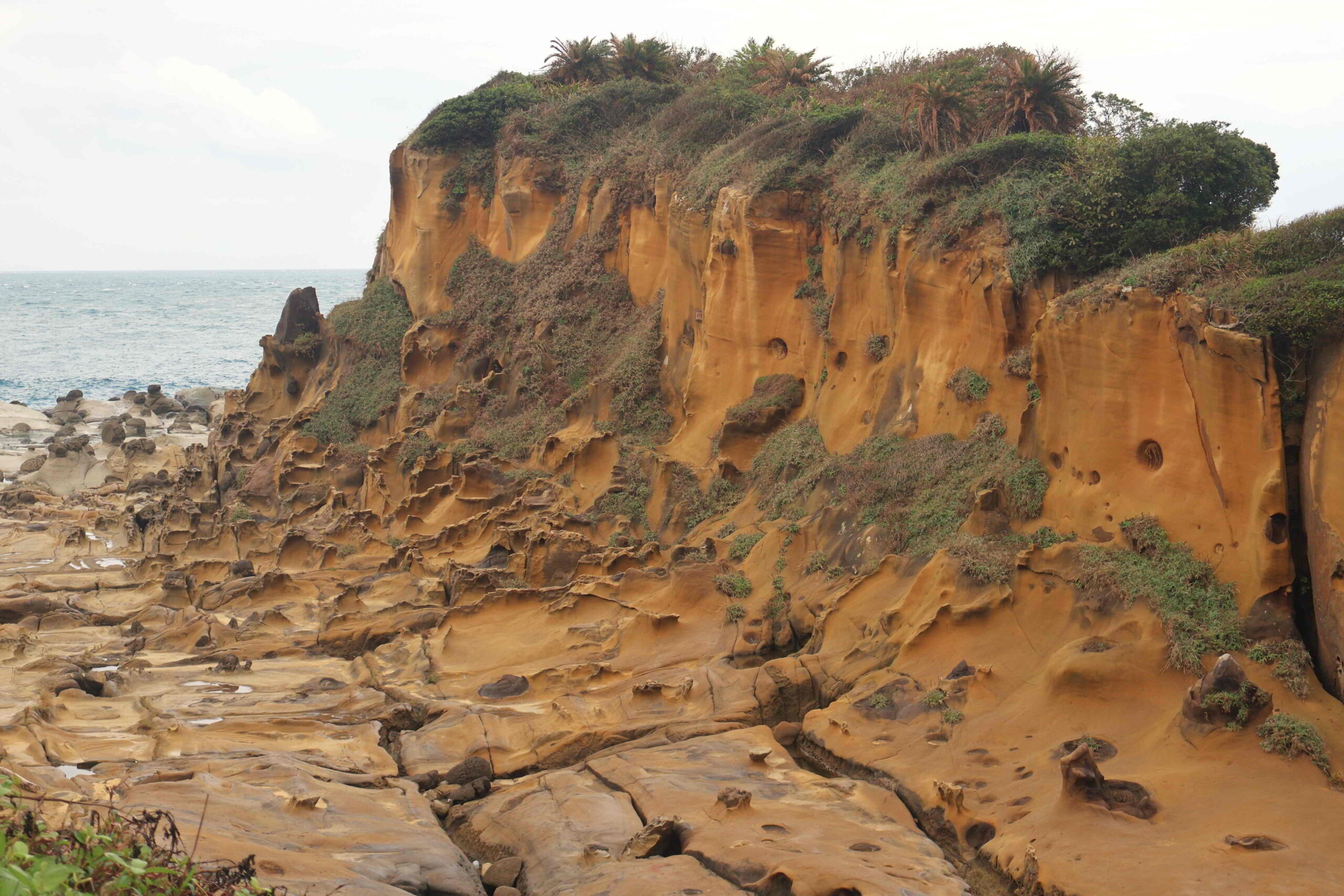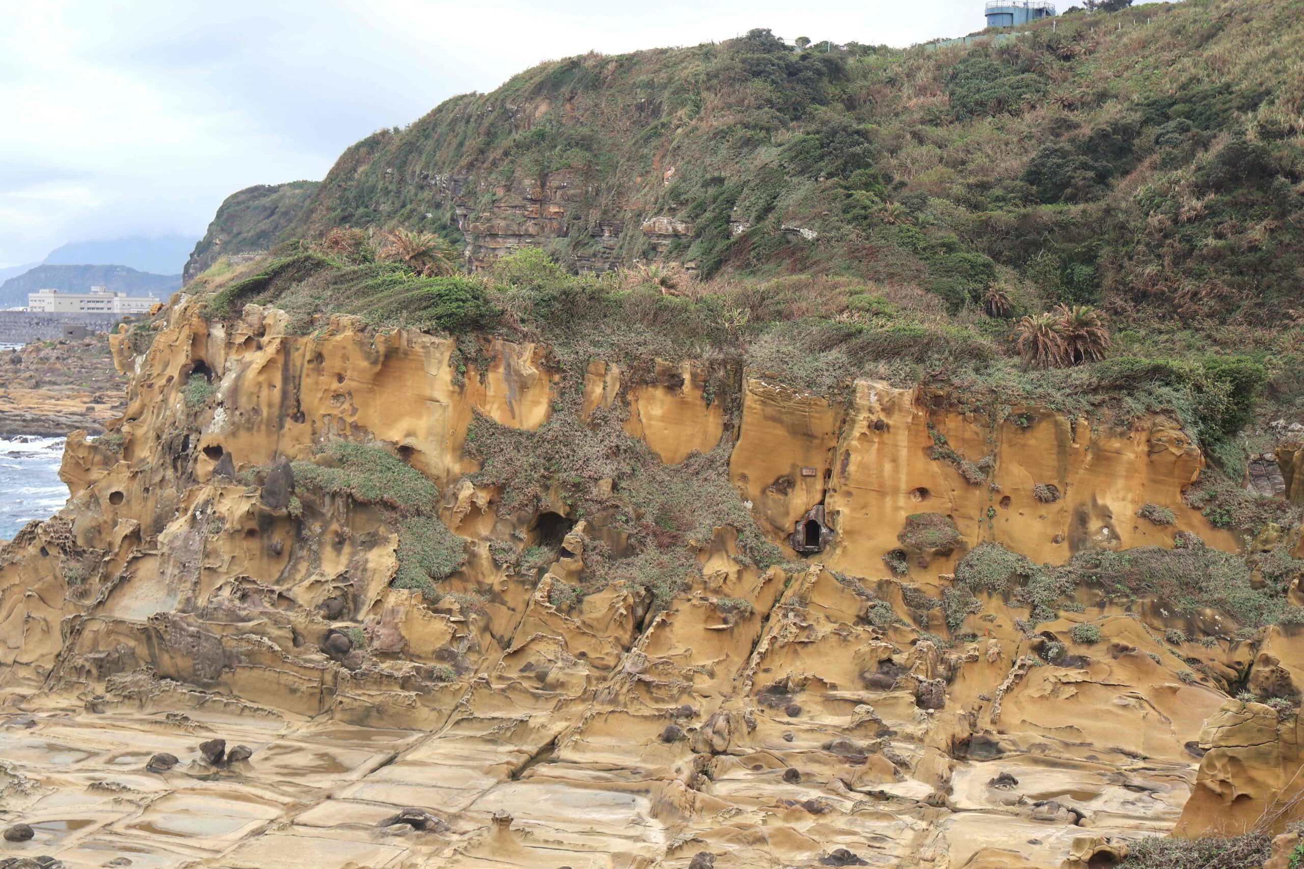 The boardwalk passes a fringe of padanus growing along the periphery of the undulating sandstone flats, a reminder of Taiwan’s subtropical ecology, culminating at an elevated gazebo and small terrace before returning to the area of the casbah structure. Due to the distance to the many tidal pools that litter the rocky shelves, I can’t tell how abundant aquatic life in in this environment, although I do see hawks flying far overhead.